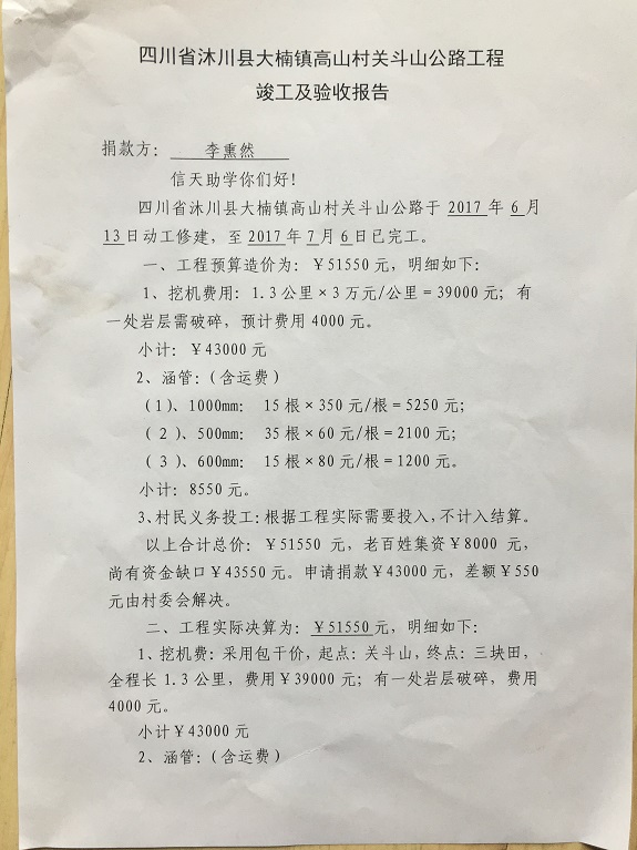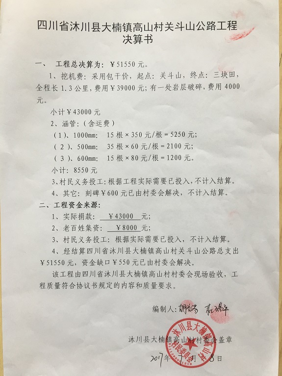 (5)修路预算分好几部分,有挖掘机、涵管、炸药爆破(山崖需要爆破)、堡坎、村民义务工、征地等。修路,我们不全包,我们出一大部分钱:挖掘费用、山崖爆破等。村民出义务工、涵管、征地费、村民小额集资。