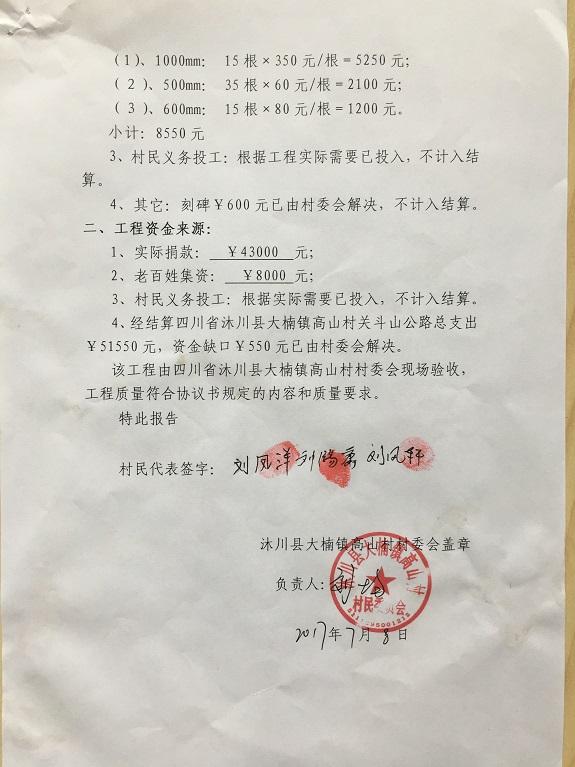 以上合计总价: 51550 元,老百姓集资8000元,尚有资金缺口 43550元。
