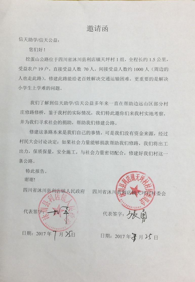 挖蛋山公路位于四川省沐川县利店镇天坪村1组,全长1.5公里,起点:山湾头,终点:挖蛋山,受益农户19户,直接受益人数70人,间接受益约1000人(周边的人也路过此路)。此路能给老百姓解决交通运输困难,更重要的是解决小学生上学难的问题。村民修路决心很大,全力集资,400元/户,共集资7600元,计划修通土路、支路、涵管、并铺设部份路面块石,力争雨季也能通车。