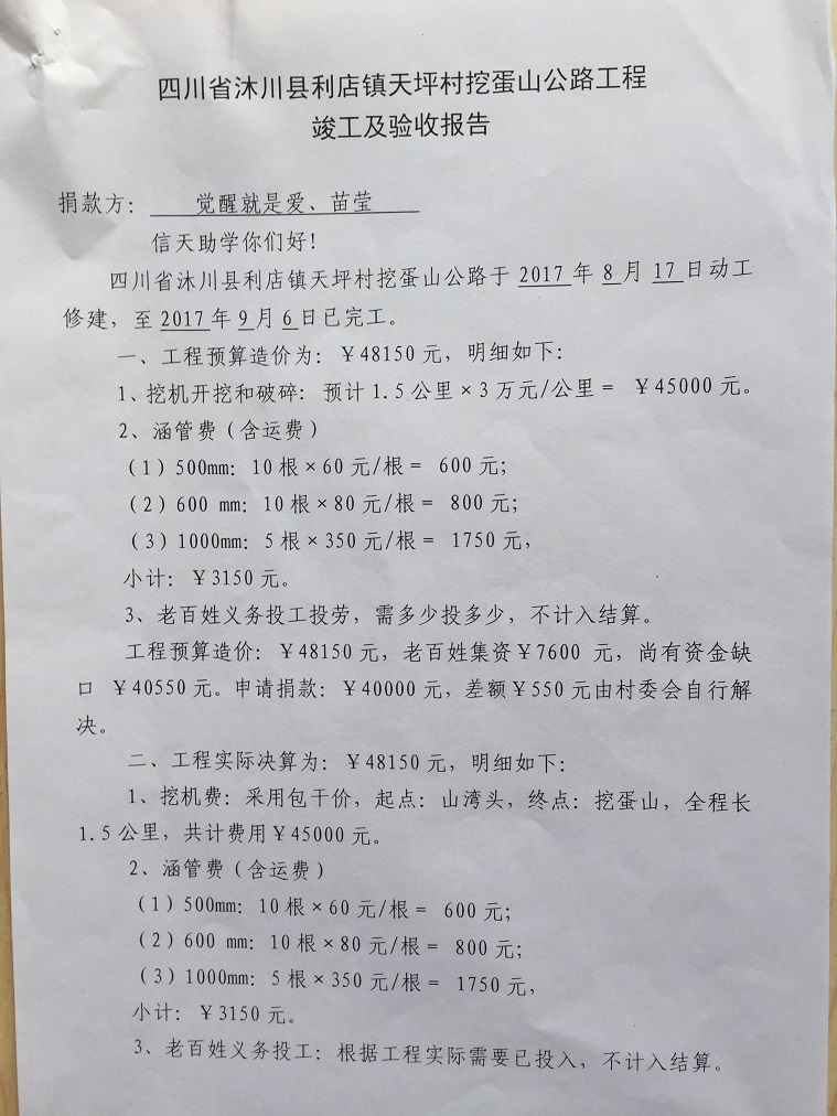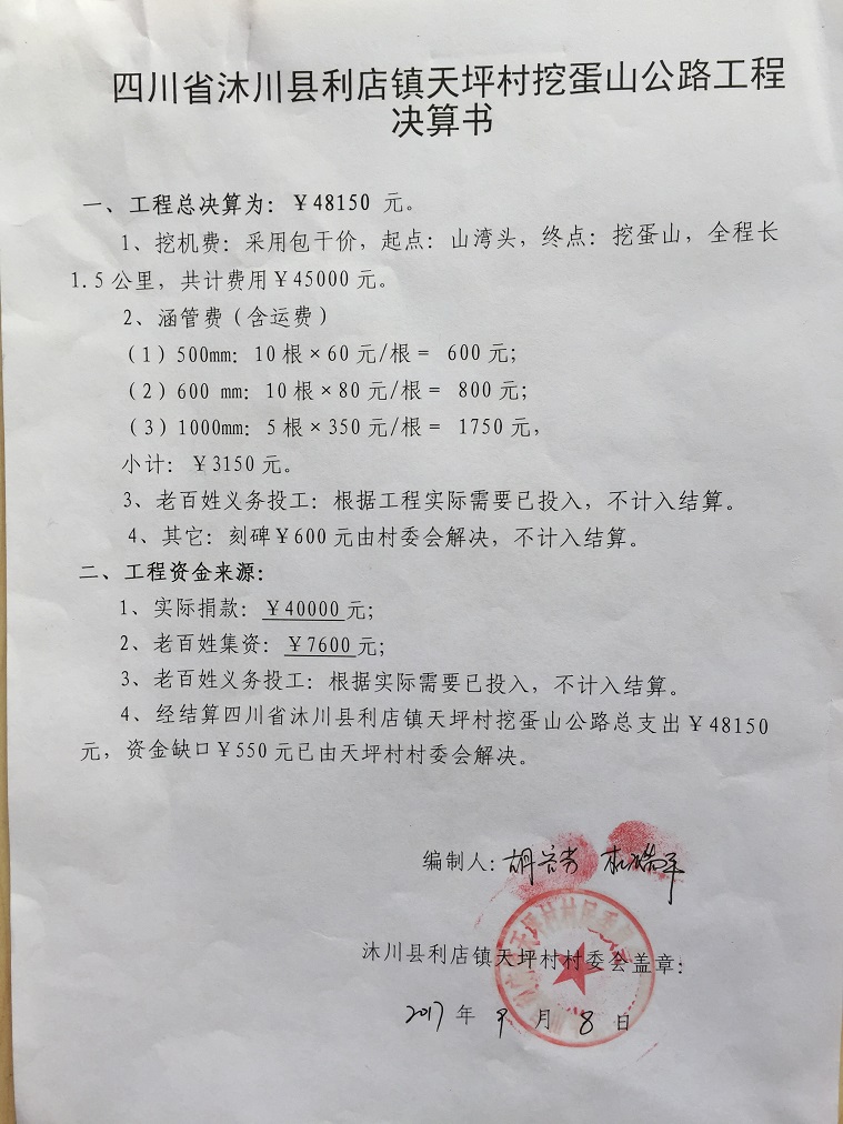 (5)修路预算分好几部分,有挖掘机、涵管、炸药爆破(山崖需要爆破)、堡坎、村民义务工、征地等。修路,我们不全包,我们出一大部分钱:挖掘费用、山崖爆破等。村民出义务工、涵管、征地费、村民小额集资。