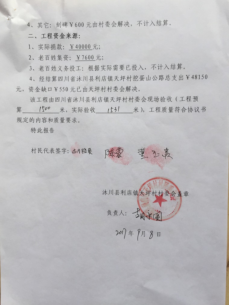 以上合计总价:48150元,老百姓集资:7600元,尚有资金缺口40550元。