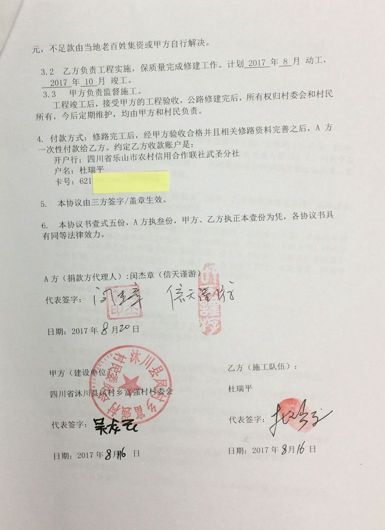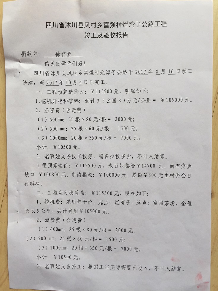 (5)修路预算分好几部分,有挖掘机、涵管、炸药爆破(山崖需要爆破)、堡坎、村民义务工、征地等。修路,我们不全包,我们出一大部分钱:挖掘费用、山崖爆破等。村民出义务工、涵管、征地费、村民小额集资。