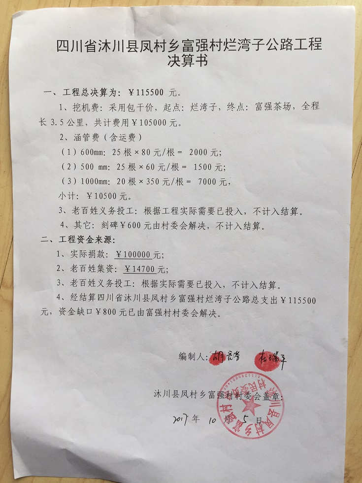 烂湾子公路位于四川省沐川县凤村乡富强村4组,全长约3.5公里,起点:烂湾子,终点:富强茶场,直接受益户42户,直接受益人数163人,间接受益人数约2000人(周边的人也走此路)。此路能给老百姓解决交通运输困难,更重要的是解决小学生上学难的问题。村民修路决心很大,全力集资,350元/户,共集资14700元,计划修通土路、支路、涵管、并铺设部份路面块石,力争雨季也能通车。