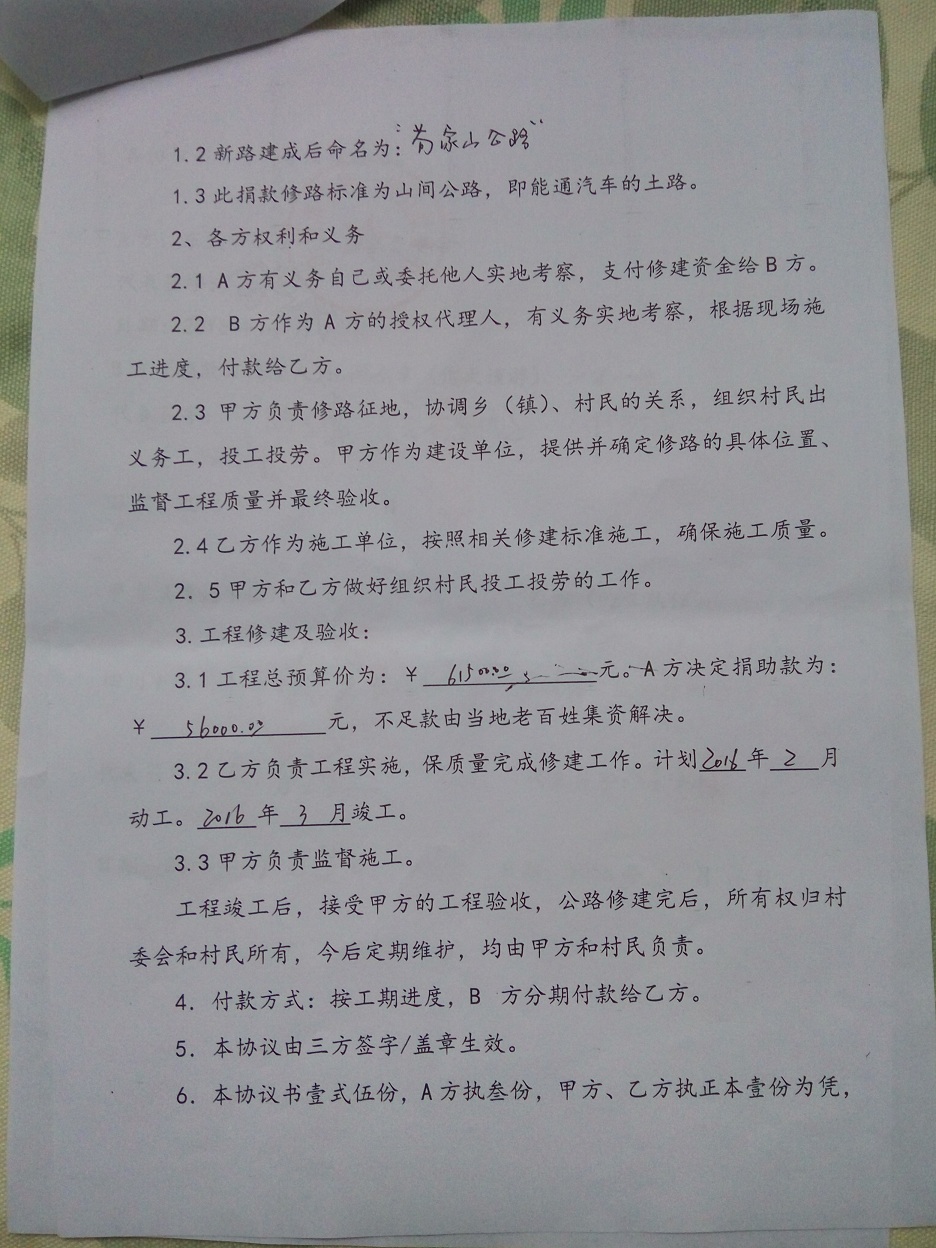 (4) 有的地方村民太困难,在大山更深处,这样,我们就尽量不让村民再集资了,只投工投劳就可以了。而,有的地方小水泥路就通到了山脚下,我们修路来接通外界的小水泥路,这样,材料可以直接运输到山脚下,村民除了投工投劳,就再集资一些钱,我们共同修建山村公路。