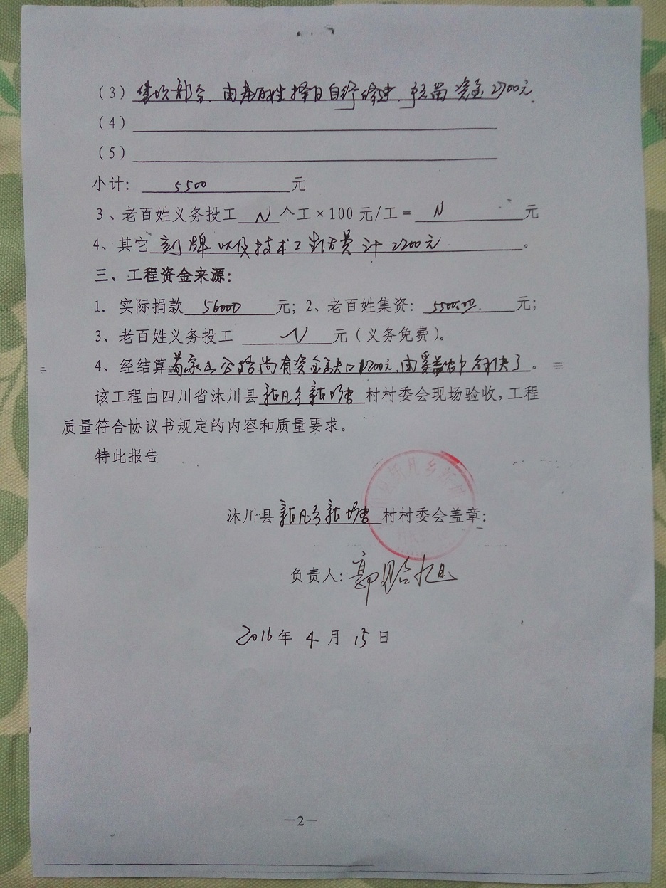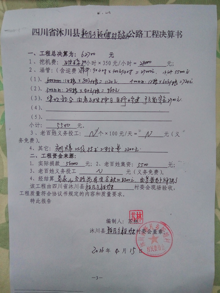 (5)修路预算分好几部分,有挖掘机、涵管、炸药爆破(山崖需要爆破)、堡坎、村民义务工、征地等。修路,我们不全包,我们出一大部分钱:挖掘费用、山崖爆破等。村民出义务工、涵管、征地费、村民小额集资。