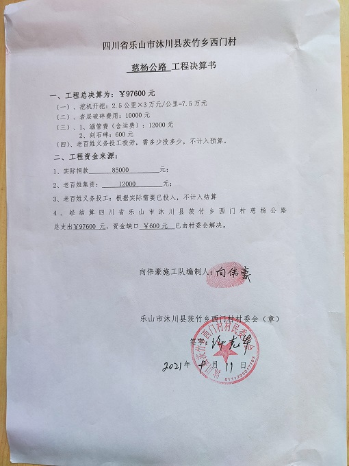 (5)修路预算分好几部分,有挖掘机、涵管、炸药爆破(山崖需要爆破)或者岩石破碎、堡坎、村民义务工、征地等。修路,捐款方不全包,捐款方出一大部分钱:挖掘费用、部分山崖爆破(如有的话)或破碎等。村民出义务工、涵管、征地费、或部分破碎费用,村民小额集资。
