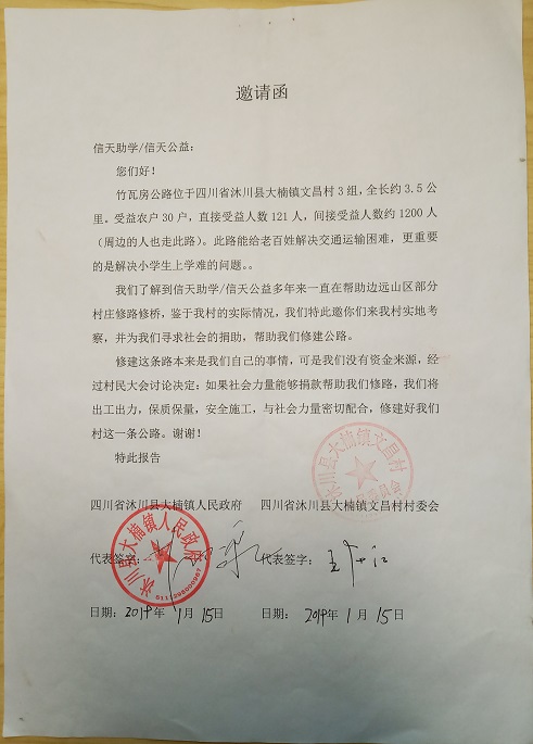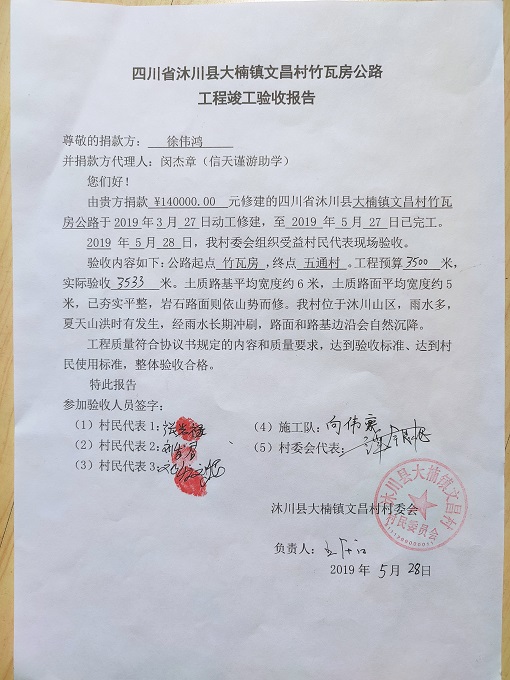 (1)爱心人捐款、村民投工投劳一起修土路,干季可以通车;