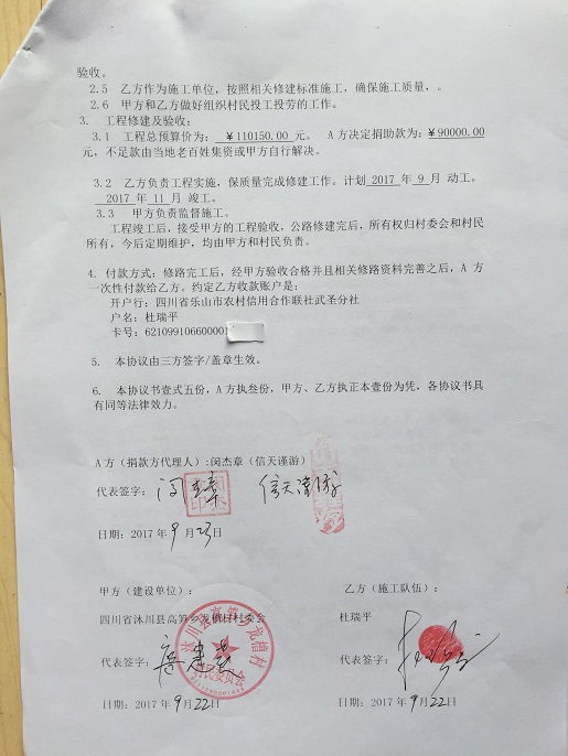 (5)修路预算分好几部分,有挖掘机、涵管、炸药爆破(山崖需要爆破)、堡坎、村民义务工、征地等。修路,我们不全包,我们出一大部分钱:挖掘费用、山崖爆破等。村民出义务工、涵管、征地费、村民小额集资。