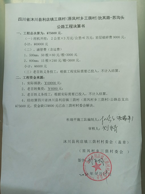 (5)修路预算分好几部分,有挖掘机、涵管、炸药爆破(山崖需要爆破)、堡坎、村民义务工、征地等。修路,我们不全包,我们出一大部分钱:挖掘费用、山崖爆破等。村民出义务工、涵管、征地费、村民小额集资。