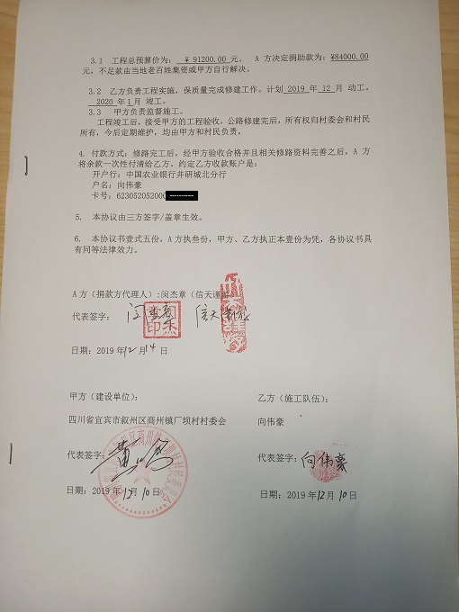 签订协议书,名单如下:东莞益农捐43812元、邱静捐2万元、梁广仁5000元、蔡润娣5000元、吴晓萍5000元、梁宝玲1000元、孙培强合家1000元、飞飞的飞1000元、不平500元、孙梓嫣100元、孙子乔100元、袁灿盛288元、蔡雨彤200元、梁智辉300元、刘敏敏300元、梁耀翔200元、梁跃曦200元;