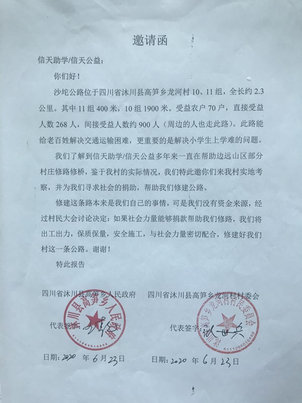 沙坨公路位于四川省沐川县高笋乡龙河村10、11组,全长约2.3公里。其中11组400米,起点:水井湾,终点:沙坨;10组1900米,起点黑水坨,终点:老深沟。受益农户70户,直接受益人数268人,间接受益人数约900人(周边的人也走此路)。此路能给老百姓解决交通运输困难,更重要的是解决小学生上学难的问题。计划修通土路、支路、涵管、并铺设部份路面块石,力争雨季也能通车。