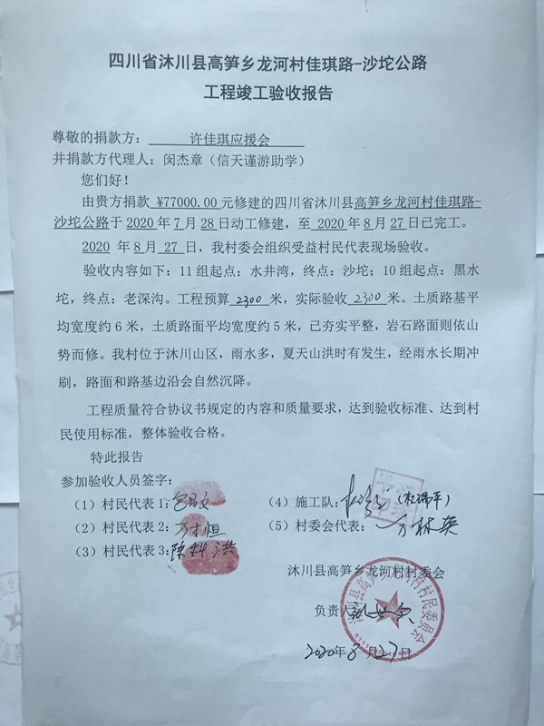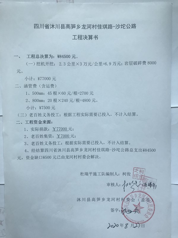(5)修路预算分好几部分,有挖掘机、涵管、炸药爆破(山崖需要爆破)、堡坎、村民义务工、征地等。修路,捐款方不全包,捐款方出一大部分钱:挖掘费用、山崖爆破等。村民出义务工、涵管、征地费、村民小额集资。