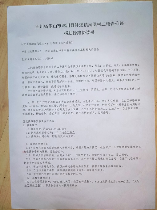 (5)修路预算分好几部分,有挖掘机、涵管、炸药爆破(山崖需要爆破)或者岩石破碎、堡坎、村民义务工、征地等。修路,捐款方不全包,捐款方出一大部分钱:挖掘费用、部分山崖爆破(如有的话)或破碎等。村民出义务工、涵管、征地费、或部分破碎费用,村民小额集资。