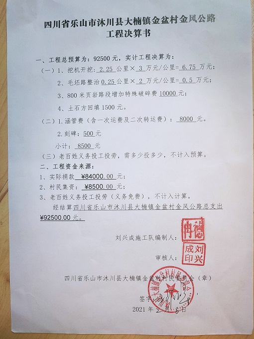 (5)修路预算分好几部分,有挖掘机、涵管、炸药爆破(山崖需要爆破)或者岩石破碎、堡坎、村民义务工、征地等。修路,捐款方不全包,捐款方出一大部分钱:挖掘费用、部分山崖爆破(如有的话)或破碎等。村民出义务工、涵管、征地费、或部分破碎费用,村民小额集资。