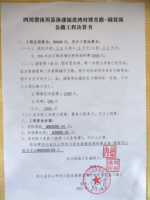 (5)修路预算分好几部分,有挖掘机、涵管、炸药爆破(山崖需要爆破)或者岩石破碎、堡坎、村民义务工、征地等。修路,捐款方不全包,捐款方出一大部分钱:挖掘费用、部分山崖爆破(如有的话)或破碎等。村民出义务工、涵管、征地费、或部分破碎费用,村民小额集资。