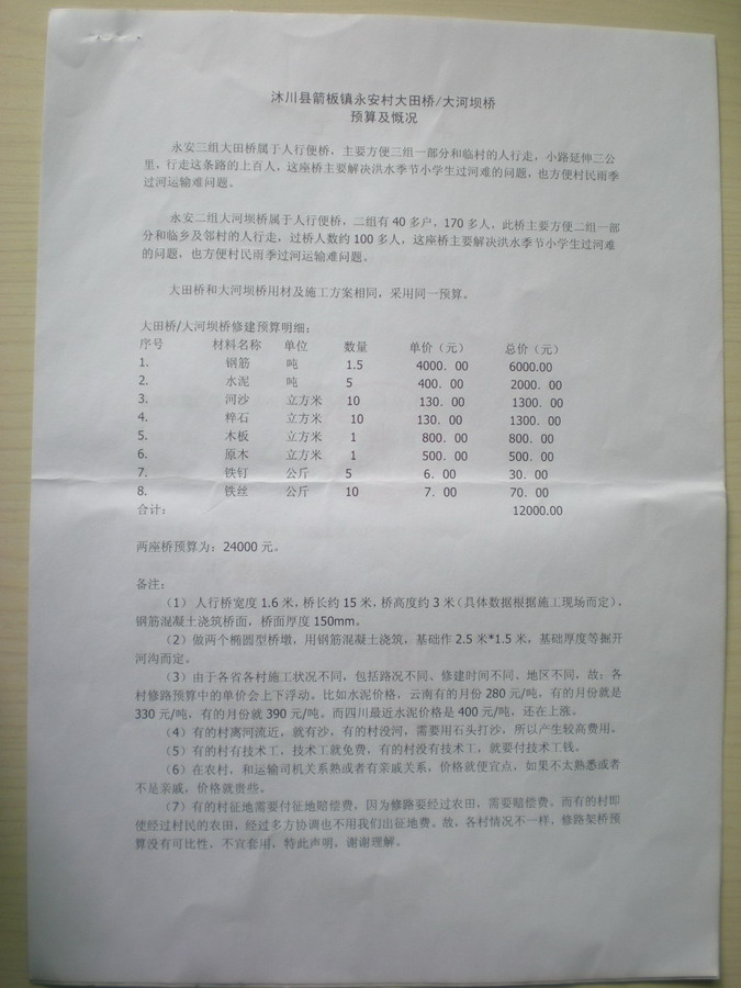 三组大田修桥预算及慨况 :