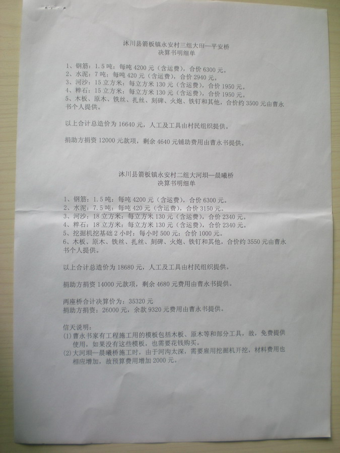 (7)有的村征地需要付征地赔偿费,因为修路要经过农田,需要赔偿费。而有的村即使经过村民的农田,经过多方协调也不用我们出征地费。故,各村情况不一样,修路架桥预算没有可比性,不宜套用,特此声明,谢谢理解。