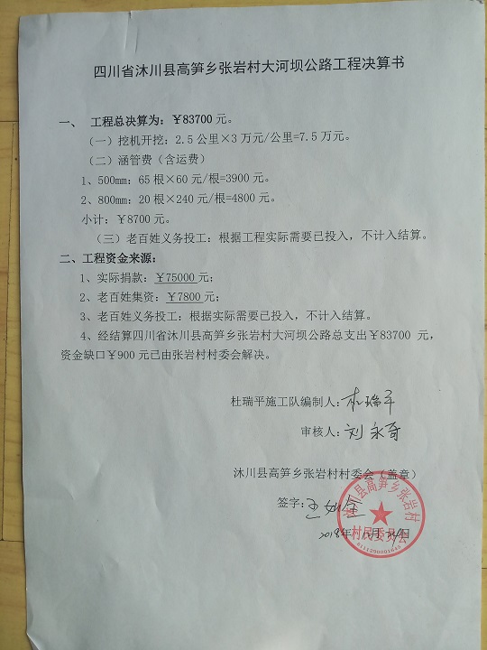 (5)修路预算分好几部分,有挖掘机、涵管、炸药爆破(山崖需要爆破)、堡坎、村民义务工、征地等。修路,我们不全包,我们出一大部分钱:挖掘费用、山崖爆破等。村民出义务工、涵管、征地费、村民小额集资。