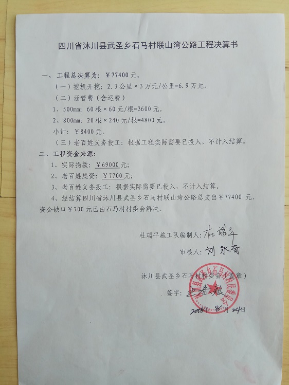 (5)修路预算分好几部分,有挖掘机、涵管、炸药爆破(山崖需要爆破)、堡坎、村民义务工、征地等。修路,我们不全包,我们出一大部分钱:挖掘费用、山崖爆破等。村民出义务工、涵管、征地费、村民小额集资。