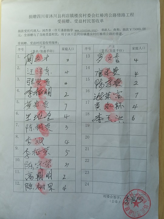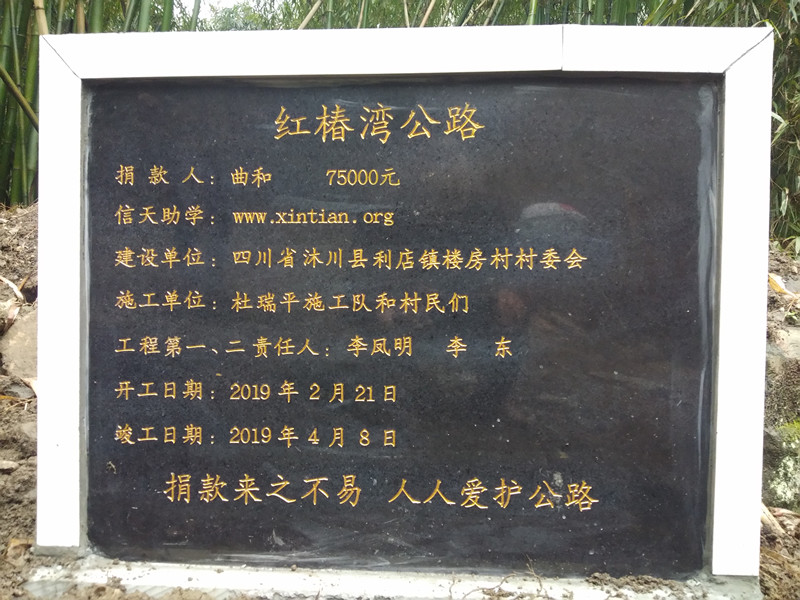 红椿湾公路位于四川省沐川县利店镇楼房村7组,全长约2.5公里,起点:冒水孔,终点:红椿湾。受益农户18户,直接受益人数71人,间接受益人数约750人(周边的人也走此路)。此路能给老百姓解决交通运输困难,更重要的是解决小学生上学难的问题。村民修路决心很大,全力集资,350元/户,共集资6300元,计划修通土路、支路、涵管、并铺设部份路面块石,力争雨季也能通车。