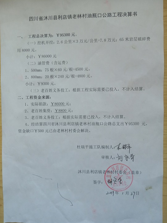 (5)修路预算分好几部分,有挖掘机、涵管、炸药爆破(山崖需要爆破)、堡坎、村民义务工、征地等。修路,我们不全包,我们出一大部分钱:挖掘费用、山崖爆破等。村民出义务工、涵管、征地费、村民小额集资.