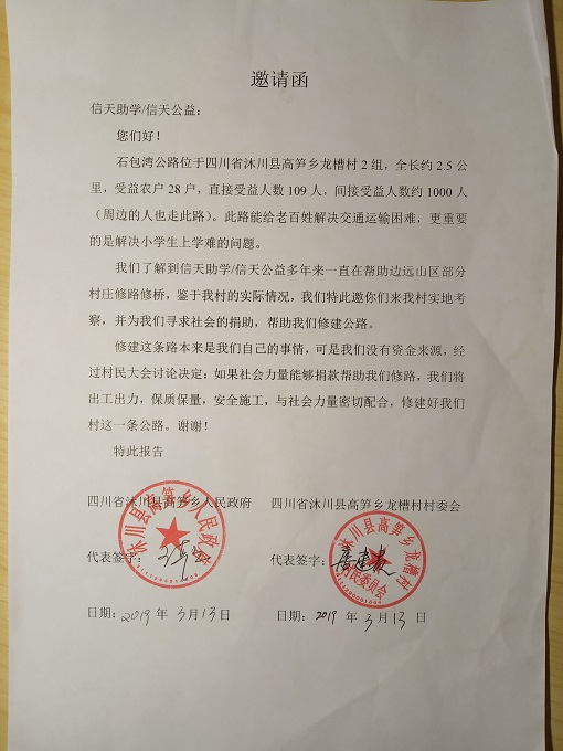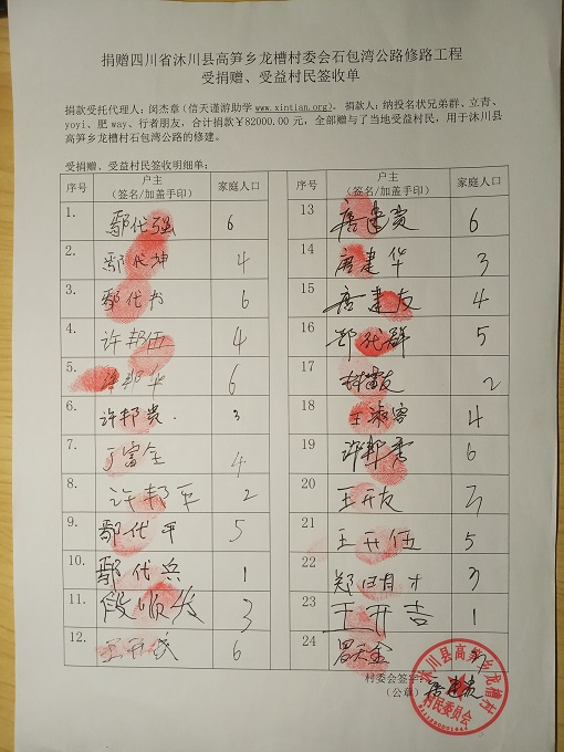 (1)爱心人捐款、村民投工投劳一起修土路,干季可以通车;