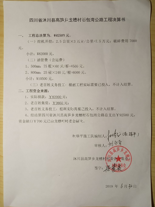 (5)修路预算分好几部分,有挖掘机、涵管、炸药爆破(山崖需要爆破)、堡坎、村民义务工、征地等。修路,我们不全包,我们出一大部分钱:挖掘费用、山崖爆破等。村民出义务工、涵管、征地费、村民小额集资。
