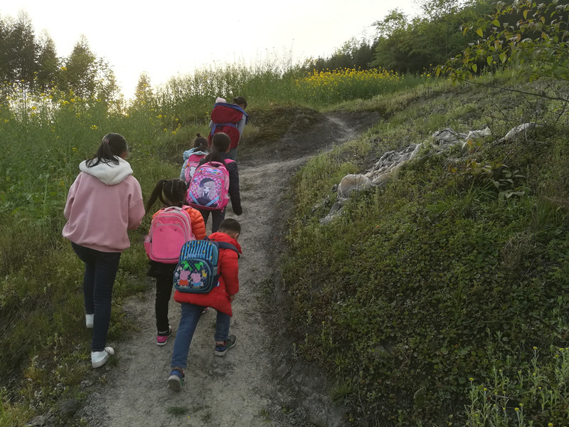 小学生上学之路,等修好了路之后,就可以坐拖拉机、面包车上学了,或者骑自行车上学了。