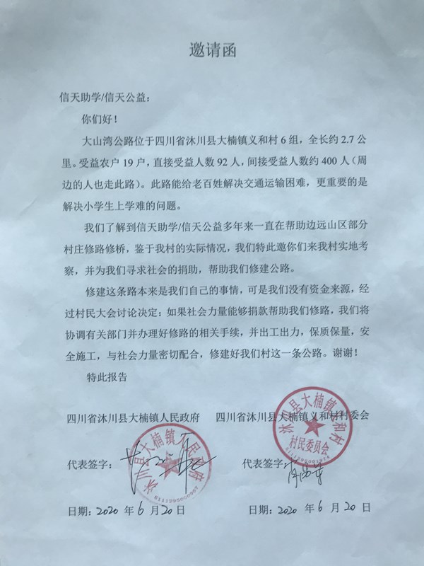 大山湾公路位于四川省乐山市沐川县大楠镇义和村6组。全长约 2.7公里,起点:大石包,终点:左上老屋基,左下大山湾;右上兰产湾,右下岩湾头。受益农户 19 户,直接受益人数 92 人,间接受益人数约 400 人(周边的人也从此路过)。修路能给老百姓解决交通运输困难、解决小学生上学难的问题。村民修路决心很大,全力集资, 5000 元/户,共集资 95000 元(用于砌筑大堡坎、30余组涵管、大面积岩层破碎),计划修通土路、支路、涵管、并铺设大部份路面石。因为此路大多为岩层,所以修好之后,路面异常坚硬,路面不用第二次专门外运铺设石头子了,省去了铺石子路的费用,雨季基本也能通车。