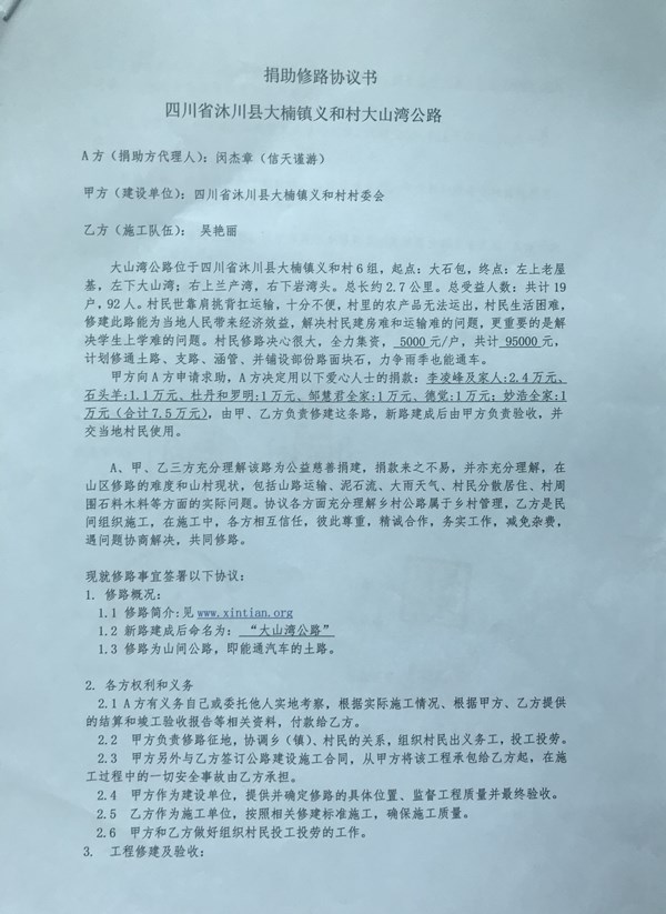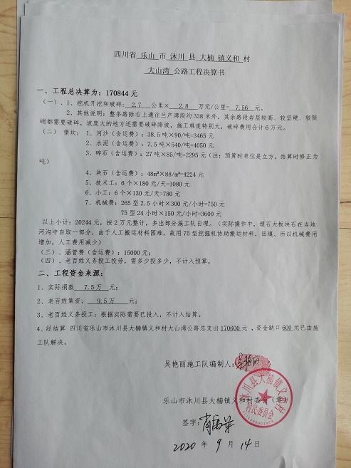 (5)修路预算分好几部分,有挖掘机、涵管、炸药爆破(山崖需要爆破)或者岩石破碎、堡坎、村民义务工、征地等。修路,捐款方不全包,捐款方出一大部分钱:挖掘费用、部分山崖爆破或破碎等。村民出义务工、涵管、征地费、或部分破碎费用,村民小额集资。