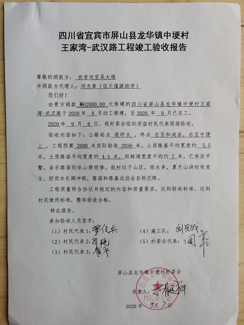 (1)爱心人捐款、村民投工投劳一起修土路,干季能通车;