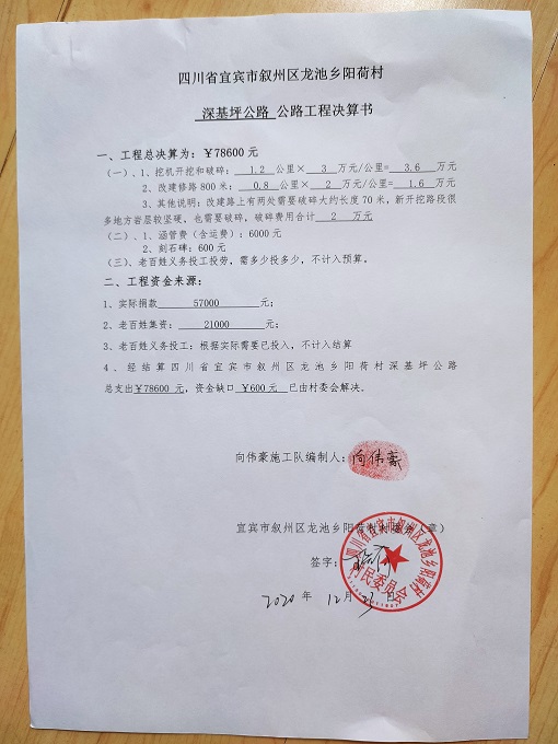 (5)修路预算分好几部分,有挖掘机、涵管、炸药爆破(山崖需要爆破)或者岩石破碎、堡坎、村民义务工、征地等。修路,捐款方不全包,捐款方出一大部分钱:挖掘费用、部分山崖爆破(如有的话)或破碎等。村民出义务工、涵管、征地费、或部分破碎费用,村民小额集资。