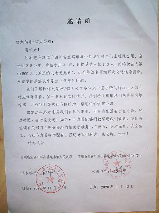 (1)爱心人捐款、村民投工投劳一起修土路,干季能通车;
