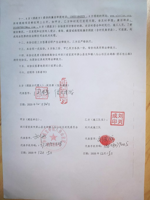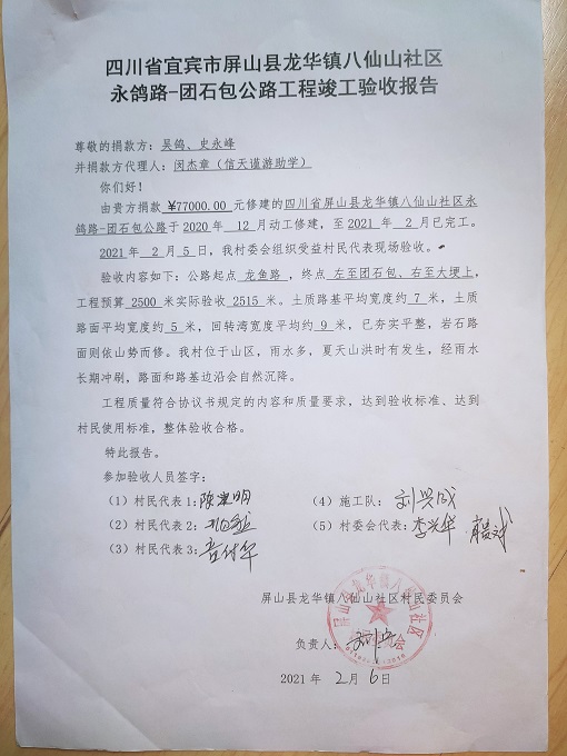 (5)修路预算分好几部分,有挖掘机、涵管、炸药爆破(山崖需要爆破)或者岩石破碎、堡坎、村民义务工、征地等。修路,捐款方不全包,捐款方出一大部分钱:挖掘费用、部分山崖爆破(如有的话)或破碎等。村民出义务工、涵管、征地费、或部分破碎费用,村民小额集资。