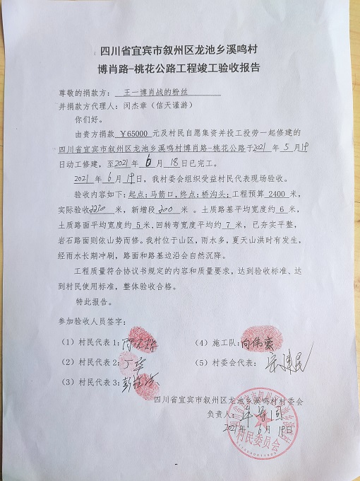 桃花公路位于四川省宜宾市叙州区龙池乡溪鸣村桃花组。全长约 2.4 公里,其中新开挖1.4公里,改建1公里。起点:马箭口,终点:桥沟头;受益农户 23 户,直接受益人数 108人,间接受益人数约 600 人(周边的人也从此路过)。修路能给老百姓解决日常出行、生产运输困难的问题,更是惠及老百姓的一条经济增收路。村民共集资 6200 元,计划修通土质路、铺设涵管、能通运输四轮车。