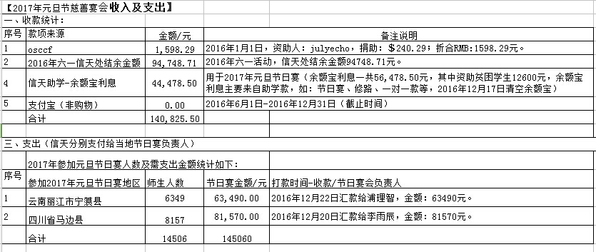 2017年元旦收支金额:140,825.50元(收入)-145,060.00元(支出)= -4234.50元。(不足的金额,信天助学先垫付,等随后有钱了,再补上。)