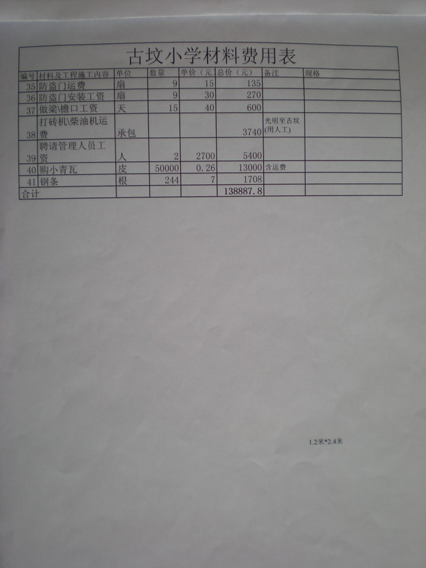 (3)、瓦:5000片×6间×(成本0.17元+一次运输0.02元+二次运输0.07元) =7800元