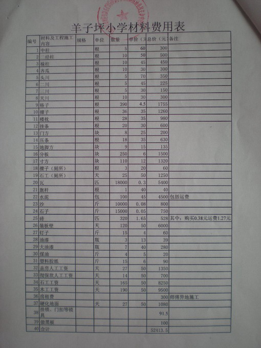 毛家山小学在预算时是砖木结构,由于公路的修建推迟,在经周忠民老师同意后以木结构为主(砖只砌1米高,其余全为木制),所以在用材料上有较大的改动,砖和沙大量减少,木料大量的增加,再加上工资的增加,在品跌后仍然超支11600元,具体如下: