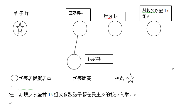 4、校点布局不合理。烂凼儿与苏坝乡永盛15组的学生到达校点至少需要一个半至两个小时。如图所示: