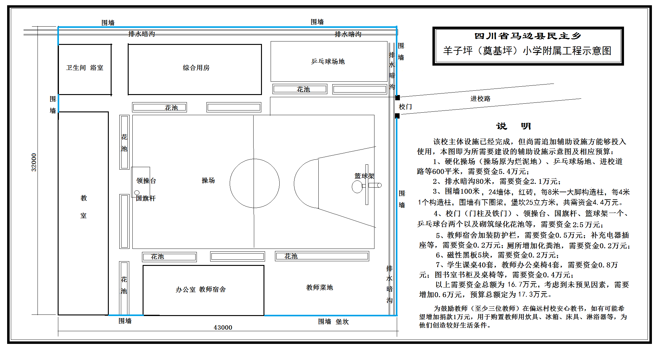 信天助学意见:2015年5月周忠民亲自到该校考察,根据现场情况画图做出预算,之后,围墙预算一项增加下圈梁和构造柱(因地基较软,有大脚构造柱更牢固),最终预算于2015年6月16日完成。建议能尽快开工修建,以便能赶上暑假开学使用。