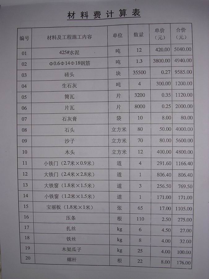 1) 水泥(425#) 12吨*420.00元/吨 5040.00