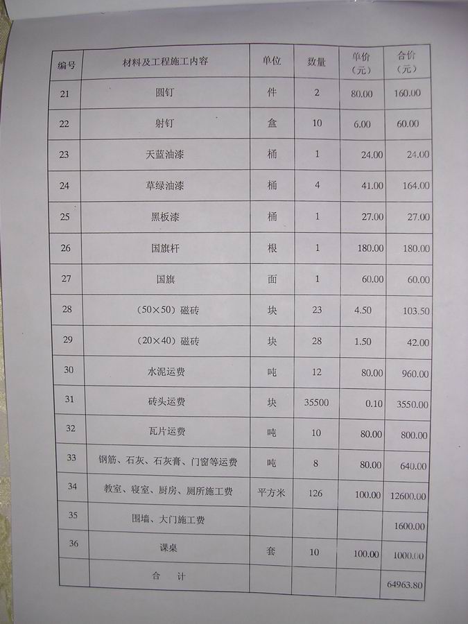 32) 教室、寝室、厨房、厕所修建施工費 126平方*100元/平方 12600.00