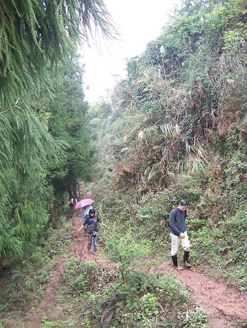 一条颜色鲜艳的青蛇不但不躲人,还主动向我冲过来,我用雨伞挡住了它,它才掉头向山坡上爬去(这里的人们看了照片,告诉我说:这是这里毒性最大的蛇了)……