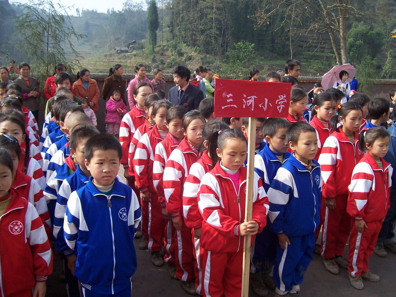 三个村校的孩子全来了,200多人呢,场面很壮观,还有很多群众自发来参加庆典