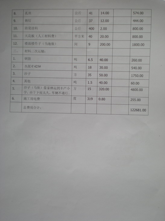 二、 按照在丰产小学施工的到场价格计算(含运输费用,民主乡属于马边县偏远的乡,运输费相对较高,丰产比东湾更远)