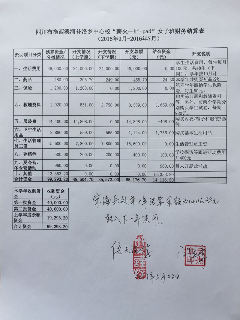 2、女童班第3年(2014.09-2015.07)总结余:信天处结余5940元,宋海兵处结余19,293.20元。