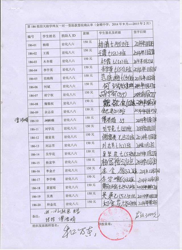 初一年级学生,编号186-01----186-20:资助款为900元/人,2014年9月----2017年7月,共六个学期,一个学期150元。