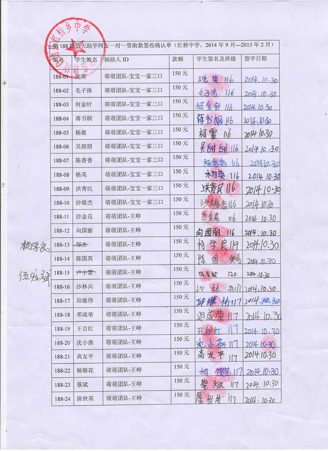 第188批红桥中学(2014年9月-2015年2月)受助生签收单
