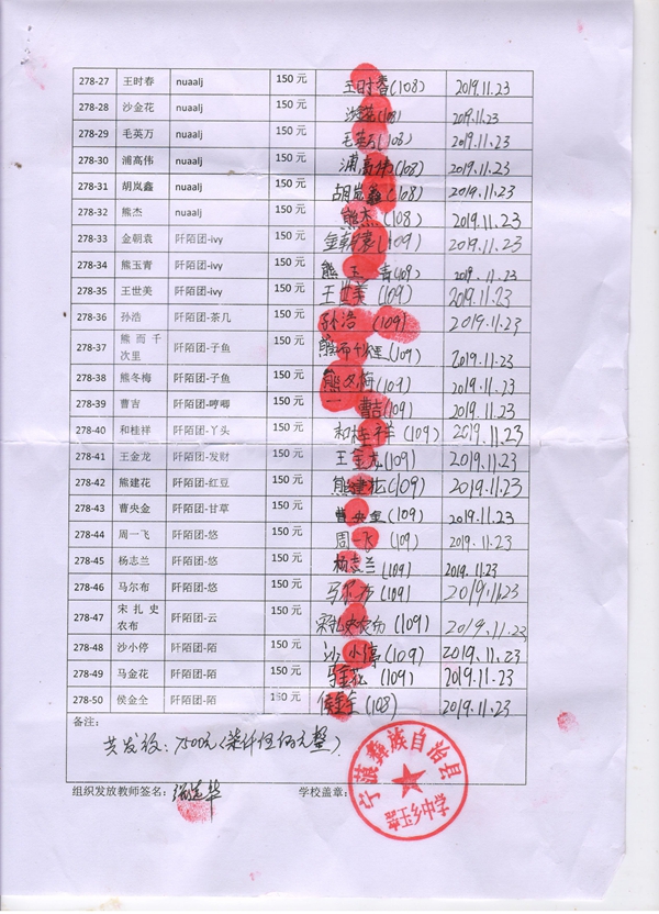 第278批宁蒗翠玉中学(2019年9月-2020年2月)受助学生签收单