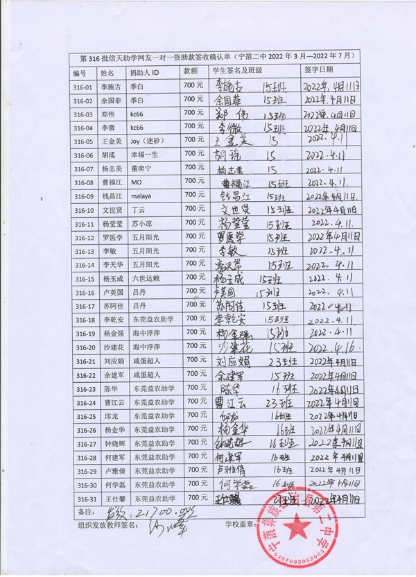 第316批宁蒗二中(2022年3月-2022年7月)受助学生签收单
